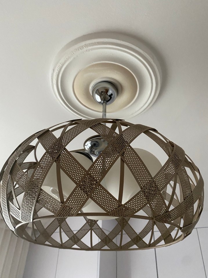 gri metal gövdesiyle geometrik desenli tavan lambası, modern bir görünüm sunar.