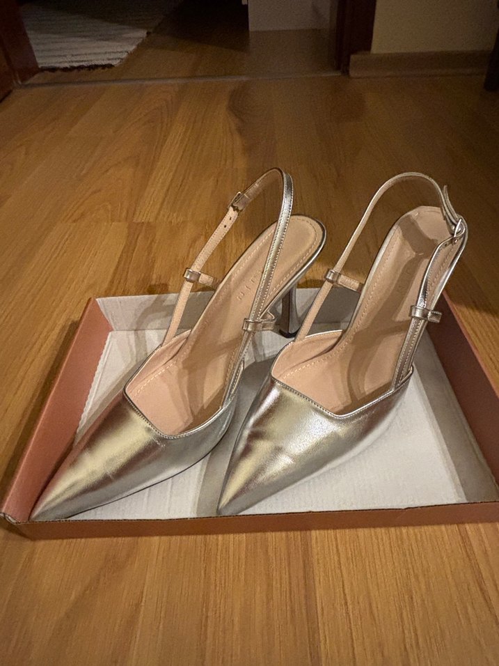 Bej metal malzemeden yapılmış, tokalı ince topuklu kadın ayakkabısı. Düğünler için uygun, çağdaş ve zarif tasarım sunar.Marjin markasıdır.Mezuniyetimde 1 kere giydim o yüzden satıyorum indirim yaparım.