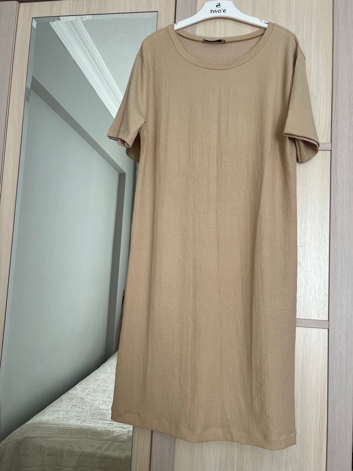 Yumuşak keten kumaştan, bol kesim, kısa kollu ve bej renk midi hamile elbisesi. Bisiklet yaka ve minimal tasarımıyla zahmetsiz şıklık sunar. Günlük kullanım için uygundur.