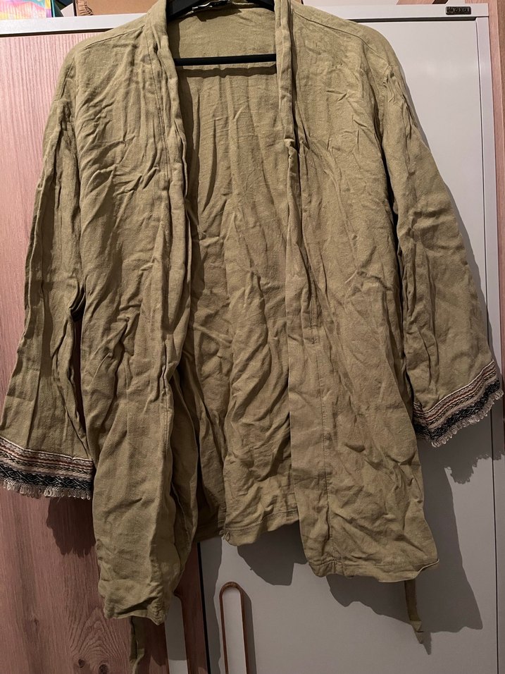 Bej renkli, keten kumaştan midi boy, salaş kesim. Uzun kollu ve kesik yakalı, bohem tarzda, günlük kullanıma uygun. Manşetlerde retro detaylar bulunur.kuşaklı Kullanmadığım için kırışık