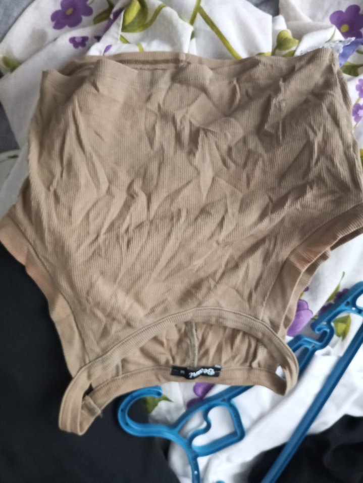 Bej renkte, midi boy, vücuda oturan ve crop bluz Yumuşak ve rahat kumaştan, desensiz tasarıma sahip.