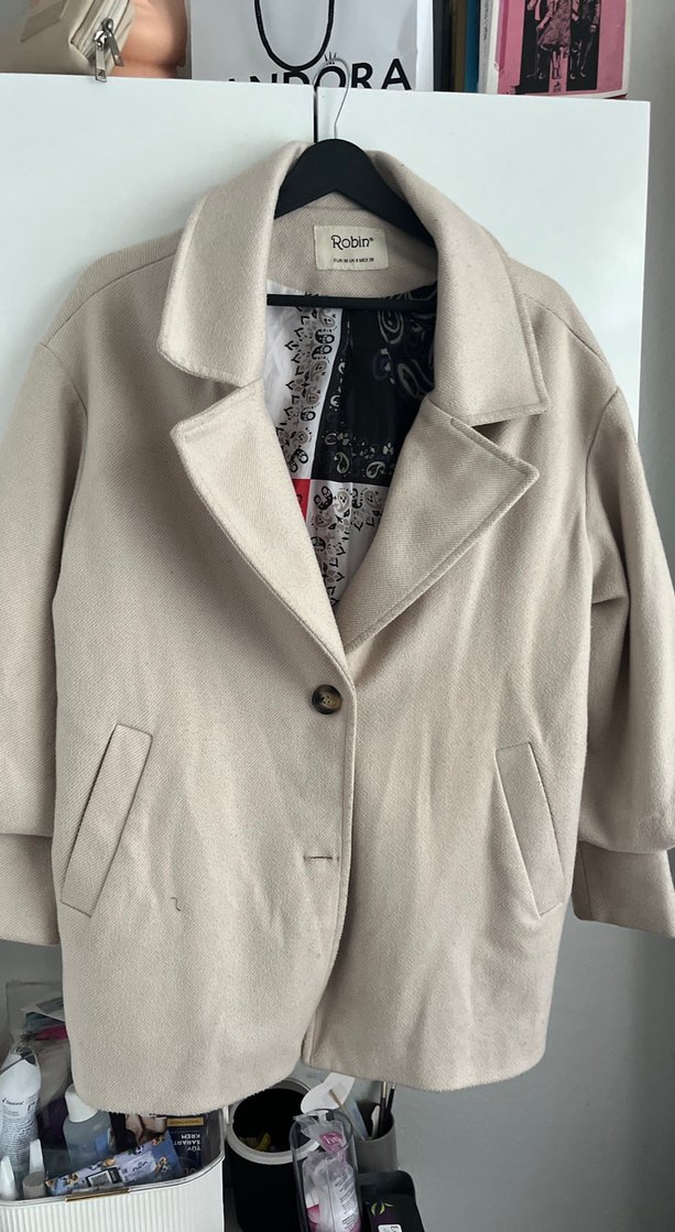 Bej renk, düğmeli, normal boyda, uzun kollu ve rahat kesim hamile kabanı. Yumuşak ve sıcak kumaştan üretilmiş, günlük kullanıma uygun Paris tarzı sokak giyim modeli.