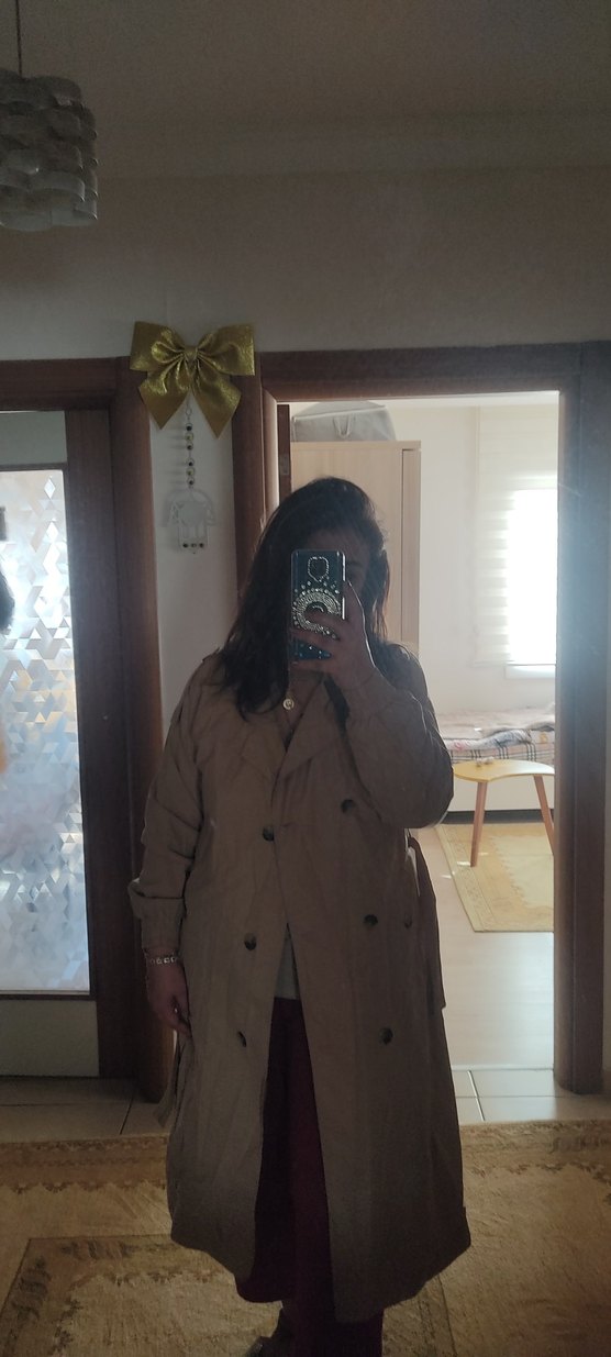 Bej renkli, midi boy, düğmeli ve geniş kesim kadın trençkot. Yumuşak ve sıcak tutan fleece kumaştan, günlük rahat kullanım için uygundur.