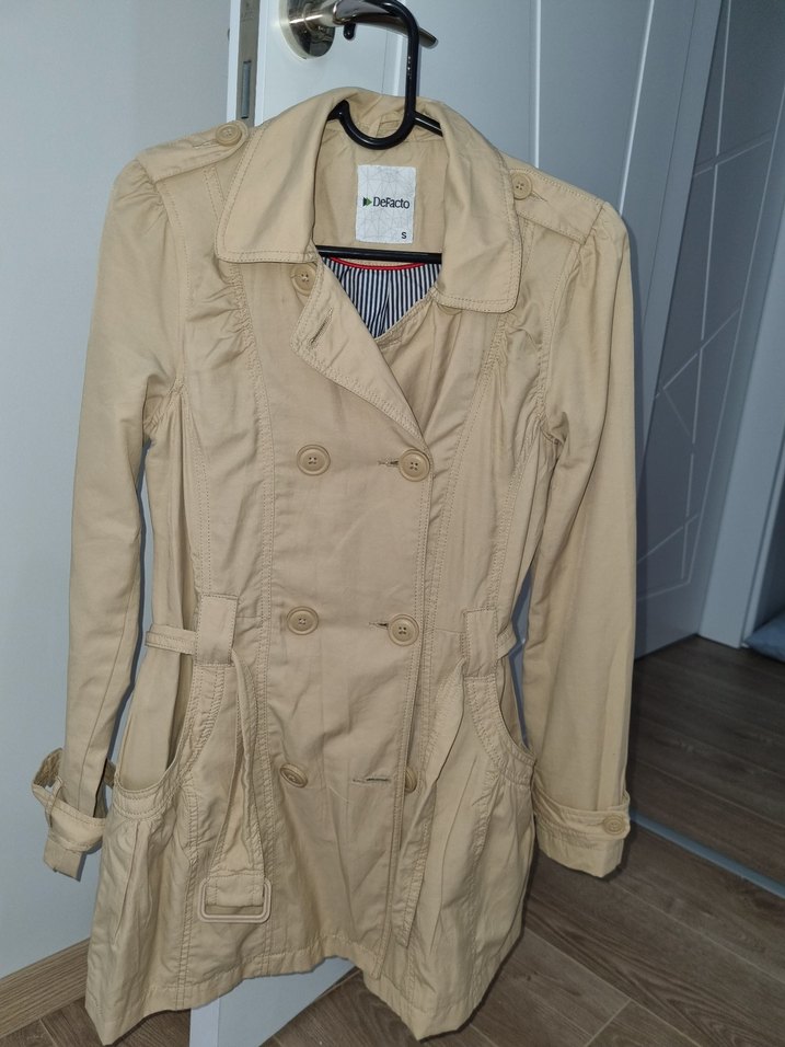 Bej renkli, midi boy kadın trençkot, çıtçıtlı ve çentikli yaka detaylıdır. Sentetik kumaştan yapılmış, rahat kesim ve uzun kolludur. hiçbir kusuru yok temiz gönderim olacaktır