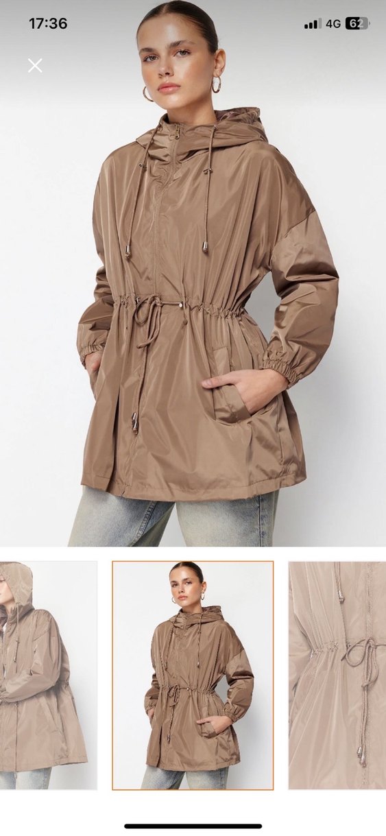 Bej renkli midi boy yağmurluk, bol kesim ve kemerli bel detayına sahiptir. Uzun kollu ve açık yakalıdır, hafif sentetik kumaştan üretilmiştir. Hiç giyilmedi