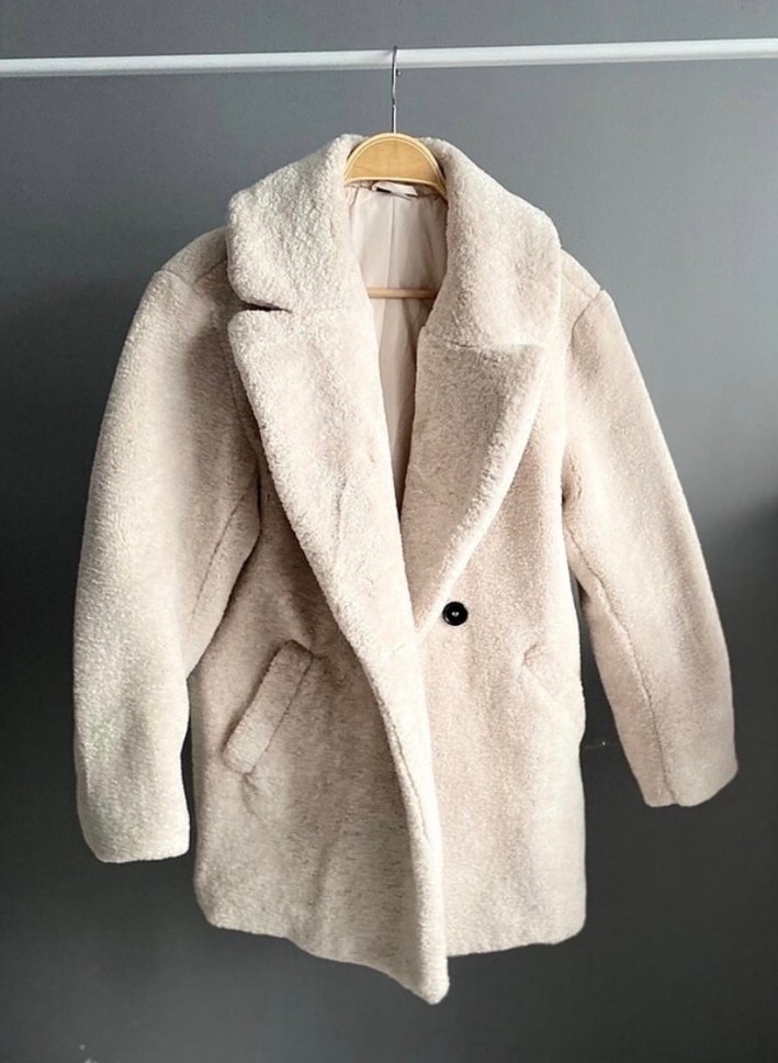 Bej renkli, midi boy, kürk detaylı ve yakalı uzun kollu kadın kabanı. Rahat kesimi ve yumuşak, sıcak kumaşıyla günlük sokak stiline uygundur.