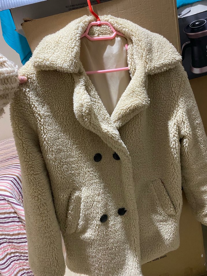 Bej renkli, midi boy, peluş kumaştan yapılmış, yaka detaylı ve bol kesim kadın kaban. Uzun kollu, çift düğmeli ve cepli, rahat sokak stili için uygundur.