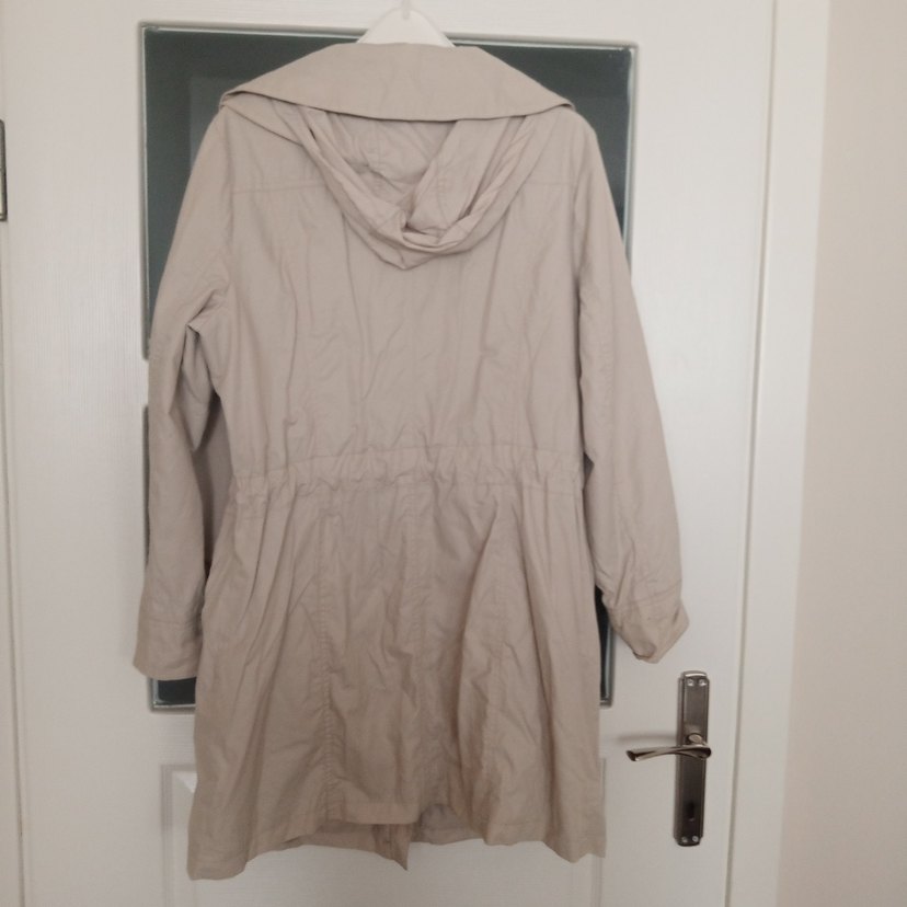 Bej midi uzunlukta, rahat kesimli 42 beden uyumlu trençkot Yumuşak keten kumaştan, uzun kollu, düğmeli ve çıtçıtlı yakalıdır.