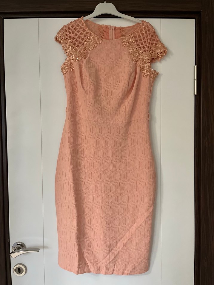 Bej midi boy, v yaka, kolsuz, dantel detaylı, vücuda oturan abiye elbise. Düğünler için uygun.