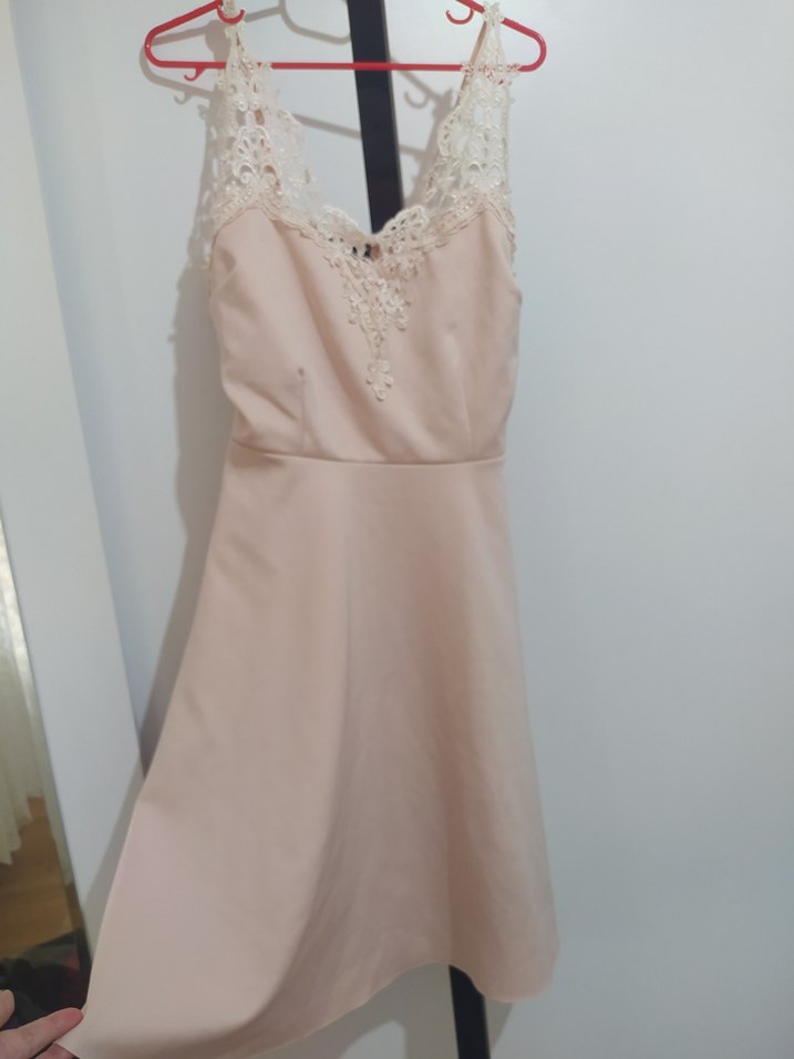 Dantel V yakalı, kolsuz bej midi elbise, bohem tarzda, düğünler için uygun, vücuda oturan kesim.