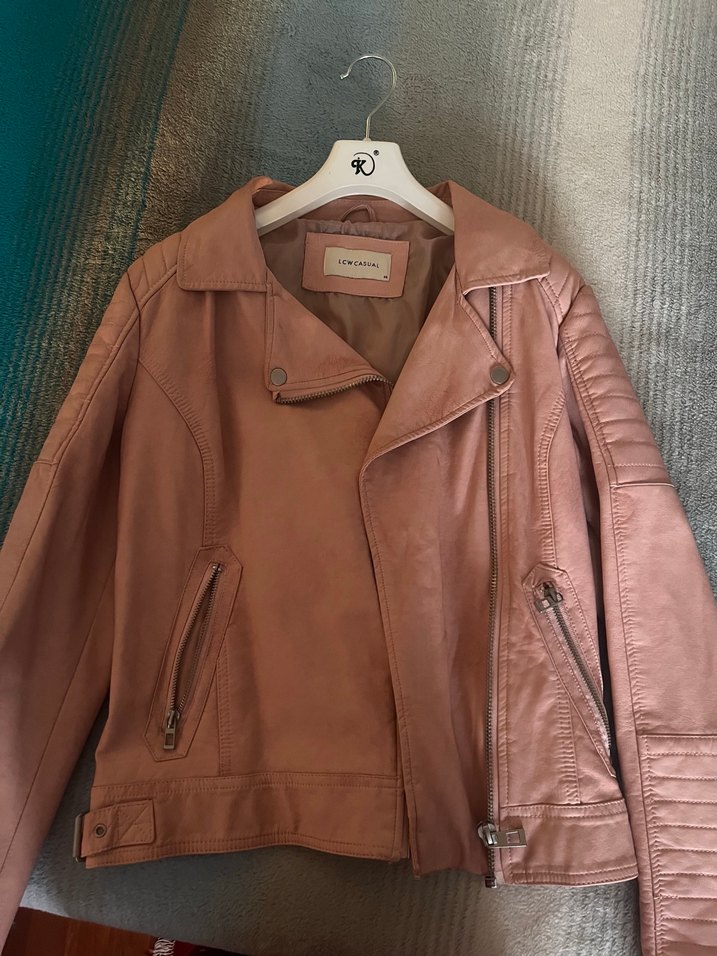 Bej deri, çıtçıtlı yakalı biker ceket, fermuarlı cepler ve bol kesimiyle midi boyda günlük kullanıma uygun.