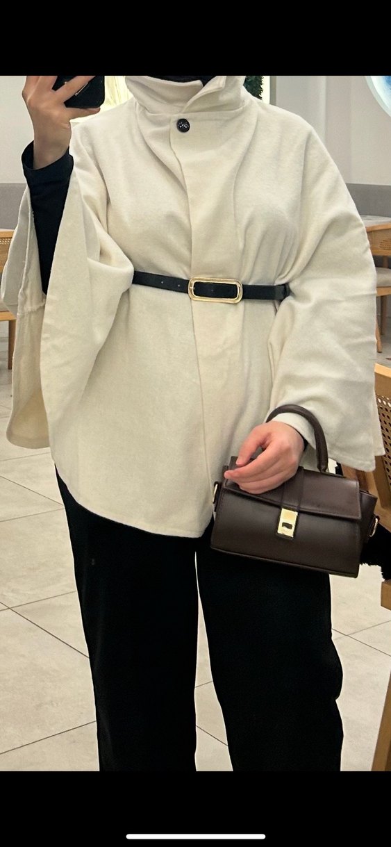 Bej Midi Deri Kemerli Kadın Kaban