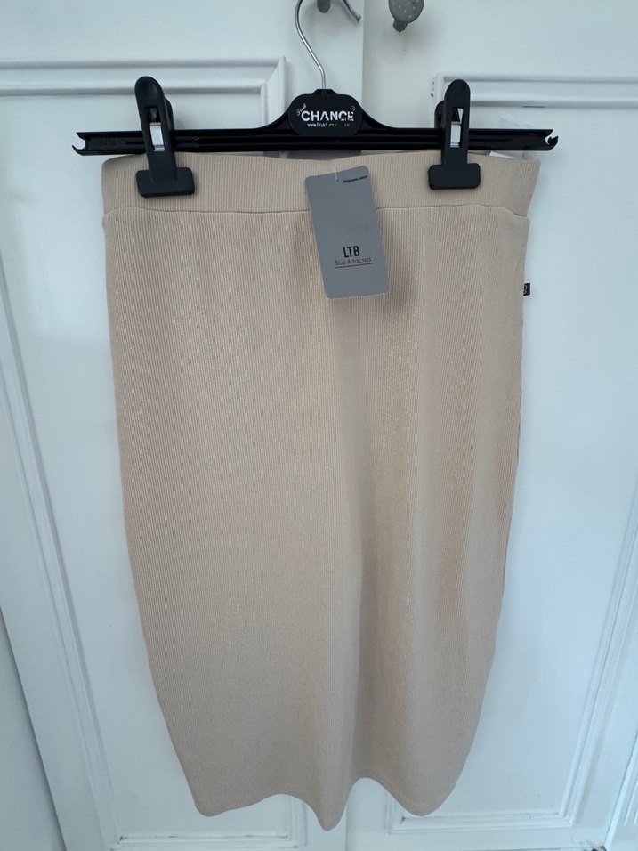 Bej renkli, midi boyda, sentetik kumaştan, kalem keMinimalist ve şık bir ofis görünümü sunar. ✨
