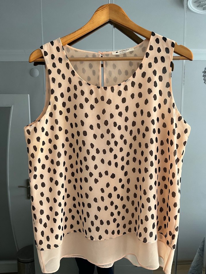 Bej renkte, kol kısmı kolsuz, dökümlü ve baskılı desene sahip, yuvarlak yakalı kadın bluzu. Rahat kesimli ve sentetik yumuşak kumaştan üretilmiştir.