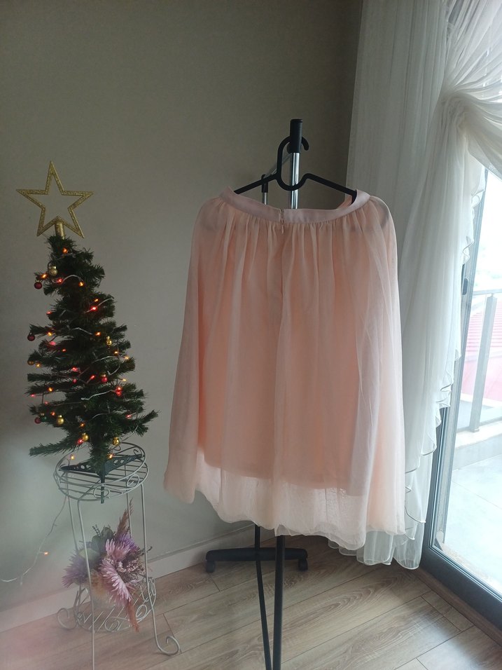 Bej renkte, midi boyda, sentetik kumaştan yapılmış, bol kesim ve drapeli kadın eteği. Minimalist tarz için uygundur.