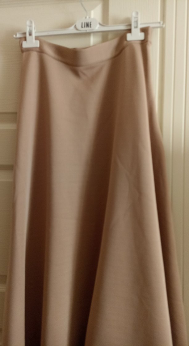 Bej midi uzunluğunda, drapeli ve bol kesim kadın eteği. Düz ve pastel tonlarda, ofis için uygun sade Paris tarzı.