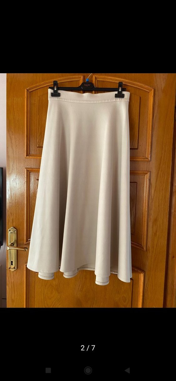 Bej renkte, drapeli tasarıma sahip midi uzunlukta, bol kesim kadın eteği. Satenimsi kumaşı ve desen içermeyen minimalist stiliyle ofis için uygundur.