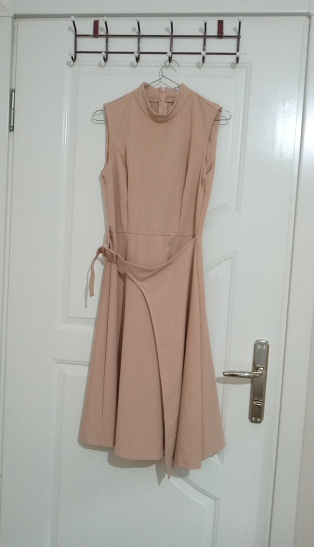 Bej midi boy kolsuz, yüksek yakalı, drapeli detaylı elbise. Ofis kullanımı için uygun, çağdaş ve rahat kesim.