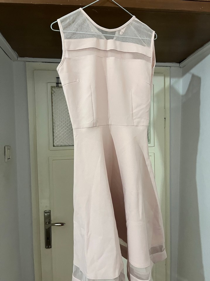 Bej renkli, kolsuz midi elbise, v yakalı ve drapeli detaylara sahip. Ofis kullanımı için uygun, şeffaf tül paneller içerir.