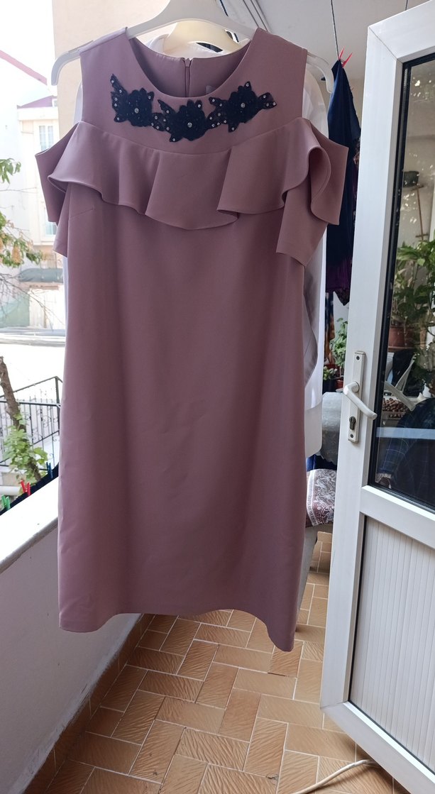 Bej midi boy, bol kesim, drapeli ve straplez yakalı elbise. Kolsuz ve hafif desenli, günlük kullanım için uygun.