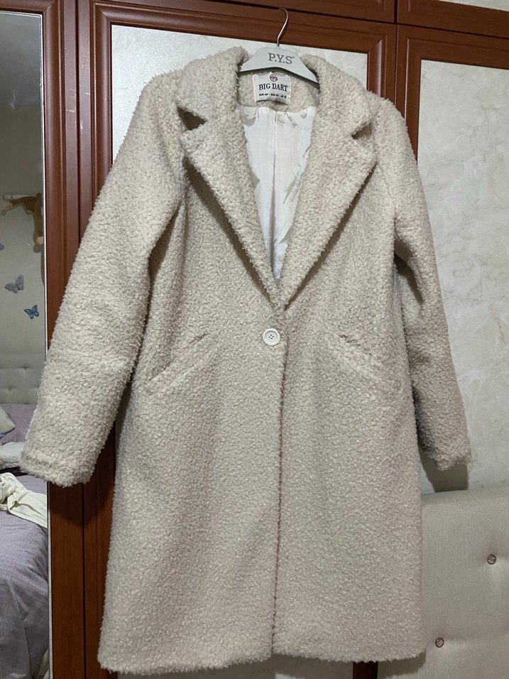 Bej renkli, düğmeli ve notched yaka kadın kabanı. Yumuşak ve sıcak kumaştan, uzun kollu ve midi boyda, rahat kesimli, gündelik kullanıma uygun sade tasarım.