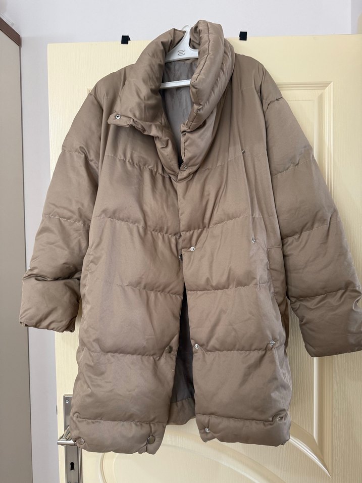 Bej renkli, düğmeli, normal uzunlukta kadın kışlık mont. Bol kesim, çıtçıtlı, uzun kollu, sokak stili için uygun, sentetik kumaştan.