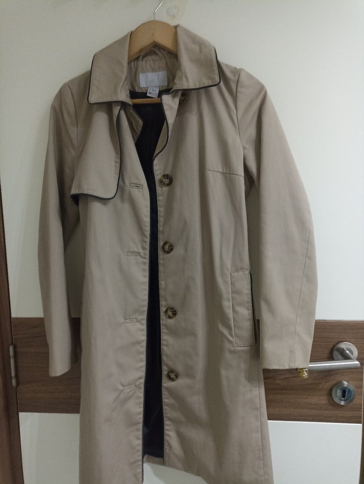 Bej midi uzunlukta, düğmeli, yakalı ve uzun kollu kadın trençkot. Düz renk, sentetik kumaştan, rahat kesim ve günlük kullanıma uygun.