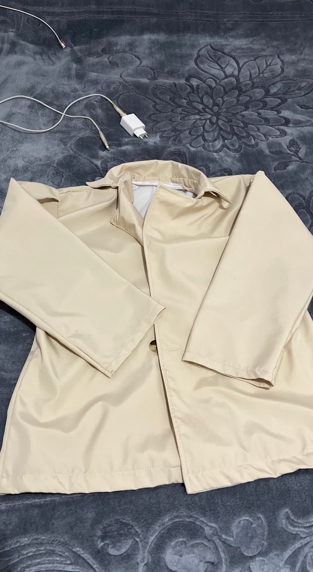Düğmeli, bej midi yağmurluk. Düz sentetik kumaştan, notched yaka ve uzun kollu, günlük kullanıma uygun.