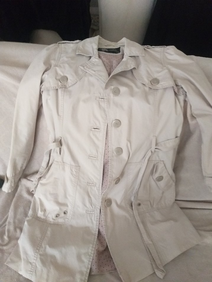 Bej midi uzunlukta, keten kumaştan, düğmeli, yakalı ve bol kesim kadın trençkot. Günlük kullanıma uygun, uzun kollu ve desensiz rahat bir modeldir.