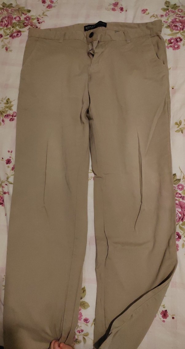 Düğmeli, rahat kesim bej keten pantolon, midi boyda, günlük rahat kullanım için uygundur. Konforlu ve sade tasarım. Ara sökülmüş