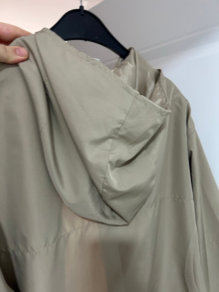 Bej renkte, kapüşonlu, V yakalı ve uzun kollu kadın yağmurluğu. Sentetik kumaştan, midi boyda ve bol kesimdir, günlük kullanım için uygundur. ️