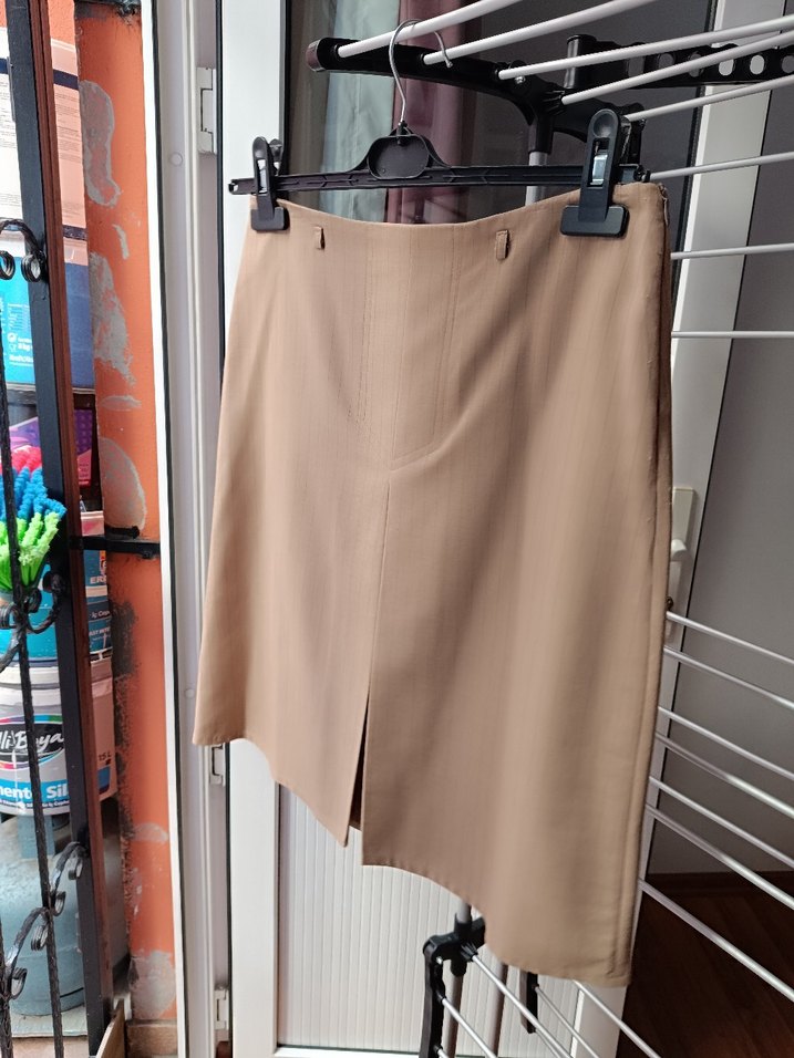 Bej midi pileli tasarım, normal kesim ve parlak yüzey. Ofis ve sokak stili için uygun. Sentetik kumaştan üretilmiştir. ✨