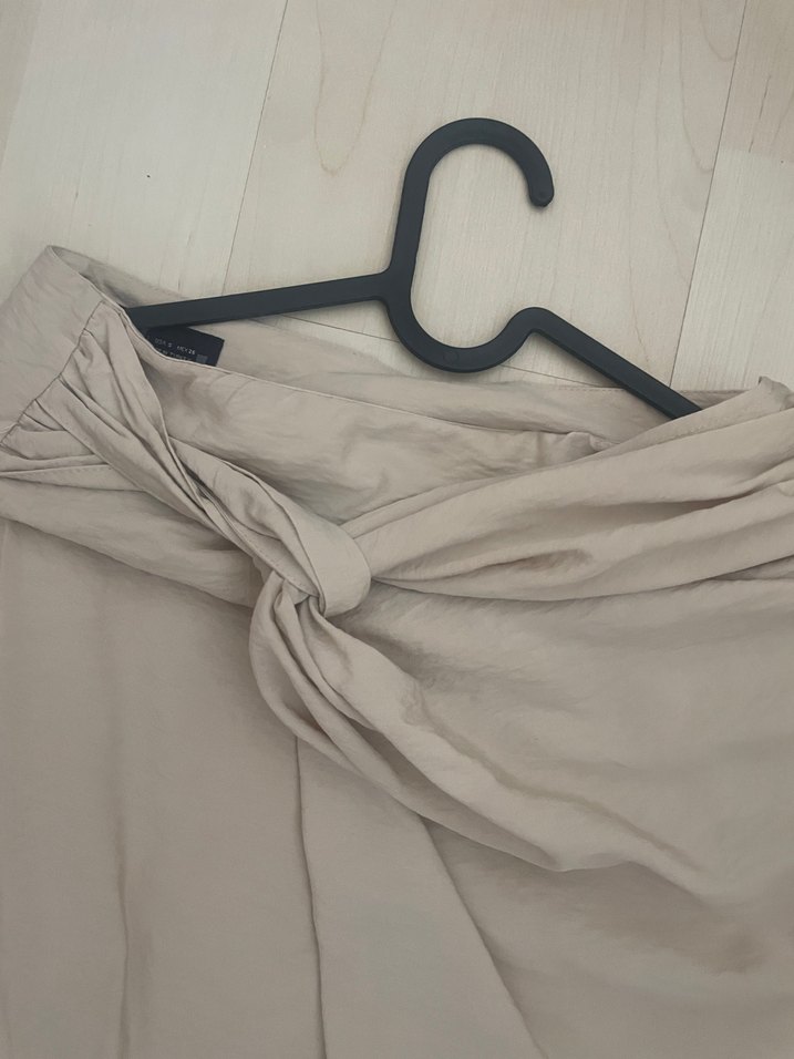 Bej renkli, yumuşak keten kumaştan yapılmış, midi boy ve drapeli kesime sahip Minimalist ve desensiz tasarımıyla günlük kullanım için uygundur.