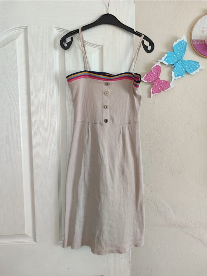 Bej renkli, ince askılı ve düğmeli ön detaylı keten midi elbise. Straplez yaka ve bohem tarzıyla günlük kullanıma uygun.