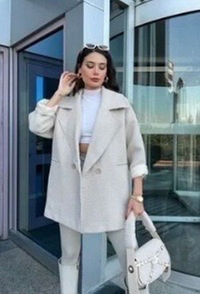 Bej midi uzunlukta kaban. Salaş kesim, uzun kollu ve ince kılçık desenlidir, günlük kullanıma uygundur. tesettürlüler için uygundur