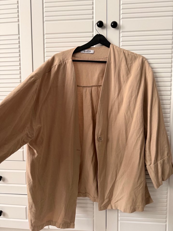 Bej renkte, keten kumaştan, notalı yaka ve uzun kollu, rahat kesimli hamile ceketi. Günlük kullanım için şık ve rahat.
