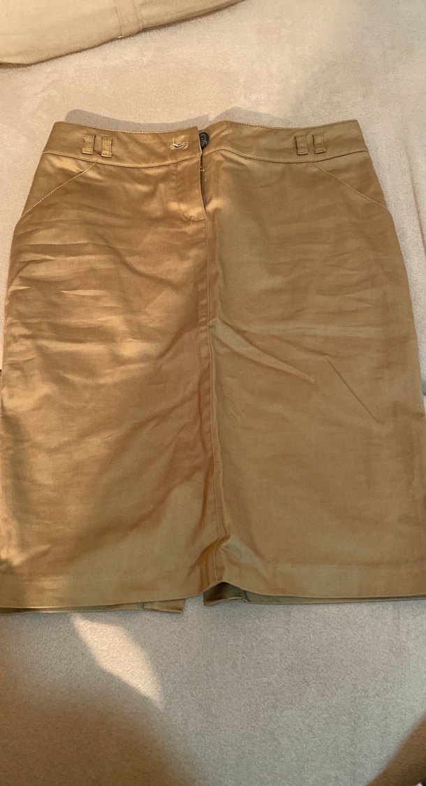 Bej renkli, keten kumaştan yapılmış, midi boy ve fitted kesim hamile eteği. Parlak yüzeye sahip, minimal bohem stilde, ofis için uygun.