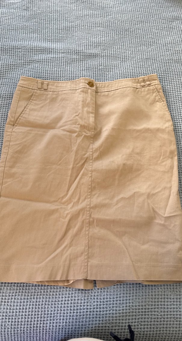 Bej renkli, keten kumaştan, normal boy midi hamile eteği. Düzenli kesim ve parlak görünüme sahip, ofis için uygundur. Boy 55 bel 39