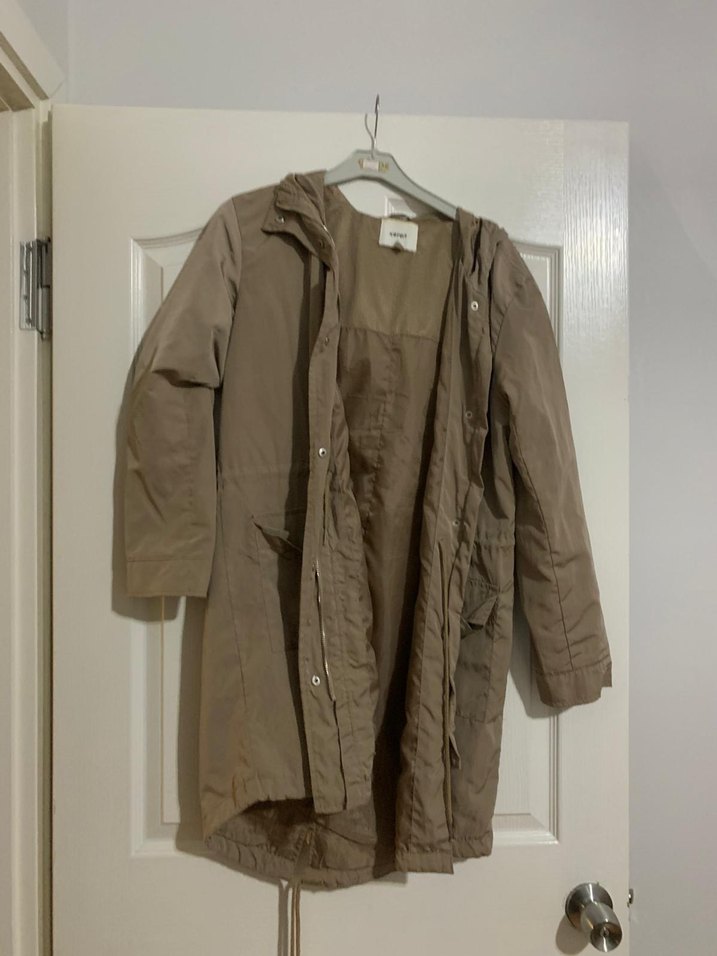Bej renk, keten kumaştan, kapüşonlu ve uzun kollu, salaş kesim midi hamile kaban. 38 beden deformesi yok astarlı yağmurluk