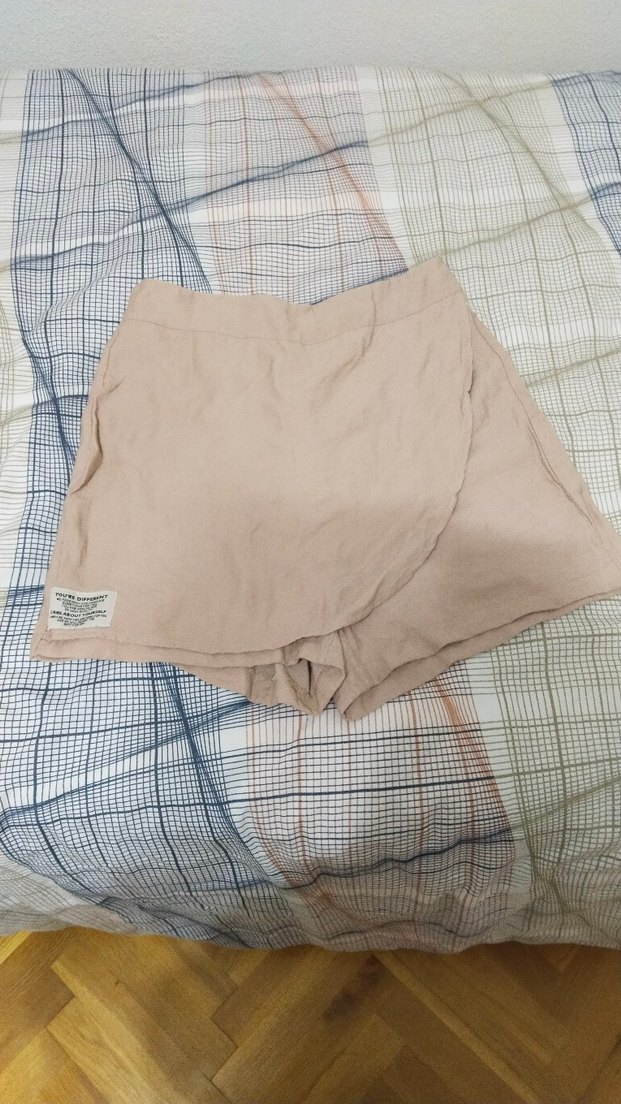 Bej renkte, yumuşak keten kumaştan yapılmış midi uzunlukta hamile şortu. Rahat kesimiyle günlük kullanıma ve sokak stiline uygundur.