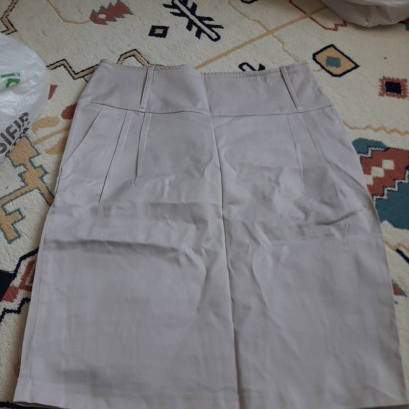 Bej renkli, pilili midi hamile eteği, rahat kesim ve yumuşak sentetik kumaştan üretilmiştir, ofis kullanımı için uygundur.