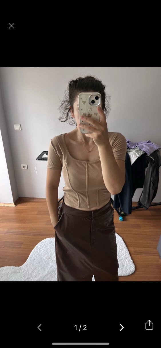 Bej renkli, midi boyda ve vücuda oturan hemşire korsesi, desen içermeyen sade bir tasarıma sahiptir.