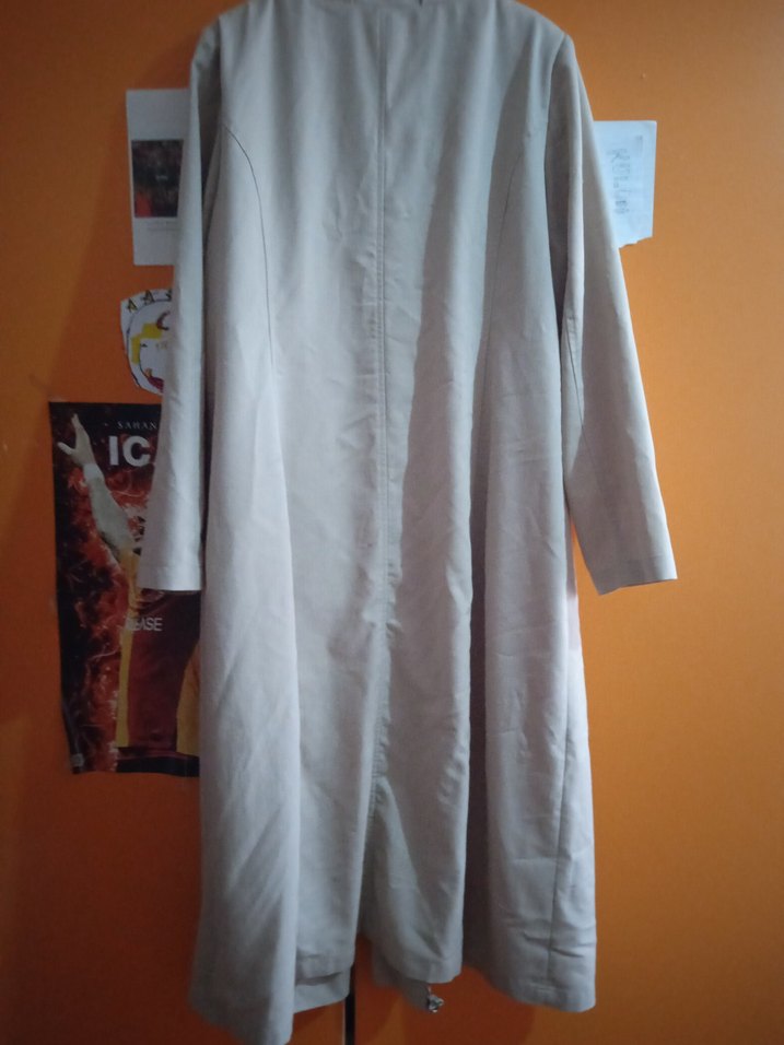 Bej renk, midi boy kab, dökümlü tasarıma sahip, uzun kollu ve kesik yaka detaylıdır. Yumuşak sentetik kumaştan üretilmiştir.