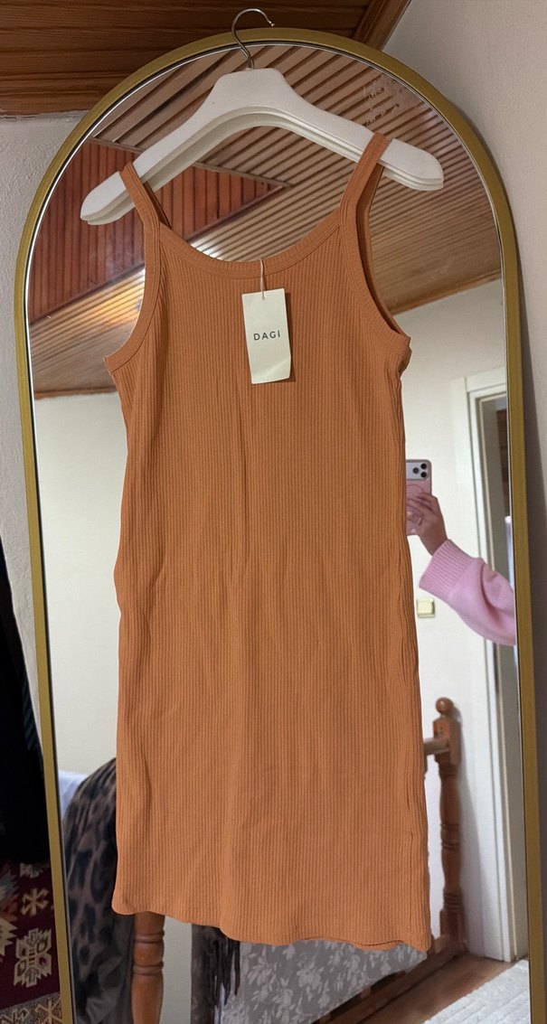 DAGI markalı, yumuşak sentetik kumaştan yapılmış bej renkli, askılı, normal boy midi kadın atlet elbisesi. Rahat ve şık günlük stil için ideal.