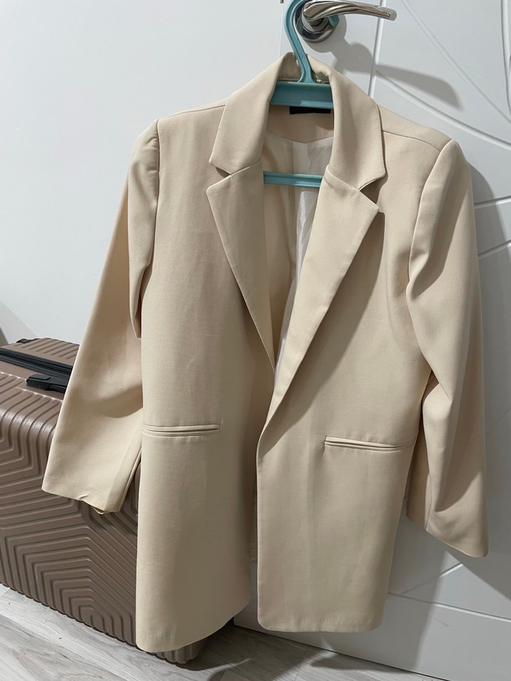 Bej renkli, notched lapel yakalı ve uzun kollu kadın blazer ceket. Midi boyda, düz desensiz ve rahat kesim. Ofis ve günlük kullanıma uygun şık bir parça.