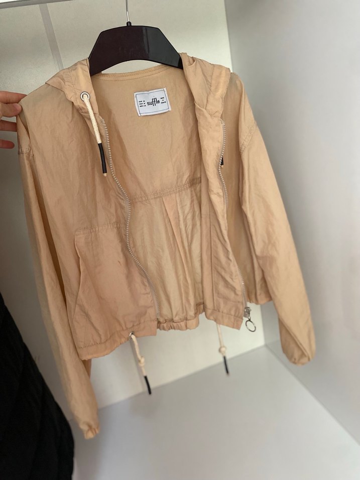 Bej renkli, midi boy, bol kesim kadın ceket. Uzun kollu, fermuarlı ve notched lapel yakaya sahip. Minimalist ve sokak stilinde, günlük kullanıma uygun.