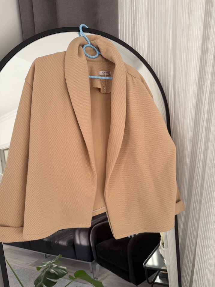 Bej midi uzunluğunda, drapeli ve notch yakalı kadın ceketi. Uzun kollu ve rahat kesim, yumuşak sentetik kumaştan üretilmiştir.