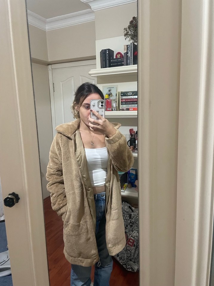 Bej renkte, midi boy ve bol kesim kadın ceket. Uzun kollu, yumuşak ve sıcak kumaştan, notched yakalı. Günlük kullanıma uygun rahat ve şık görünüm. Astarlı ve sıcak tutar. Bir kere kullanıldı, sağlam ve defosuz.