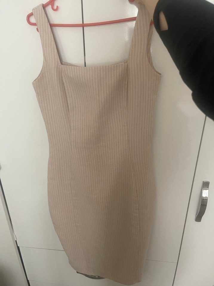 Bej renkte, kolsuz ve dar kesim midi elbise. Yumuşak sentetik kumaştan, tekdüze pileli dokusu ile günlük sokak modasına uygun.