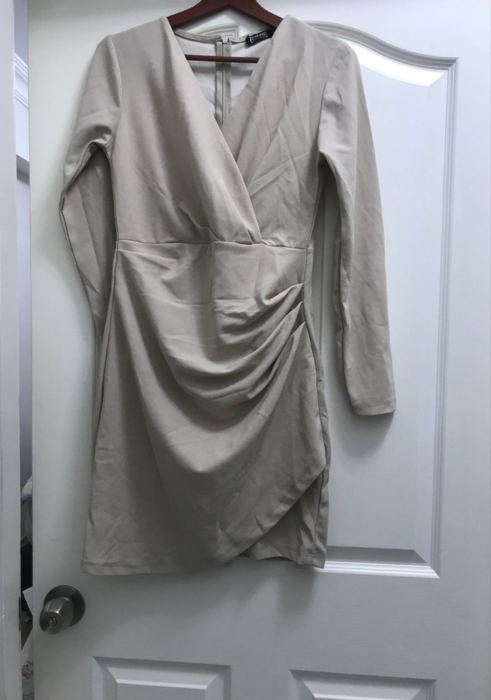 Bej renkte, uzun kollu ve beli büzgülü, minimalist tarzda midi boy kadın elbise. Modern ve desensiz tasarıma sahiptir.